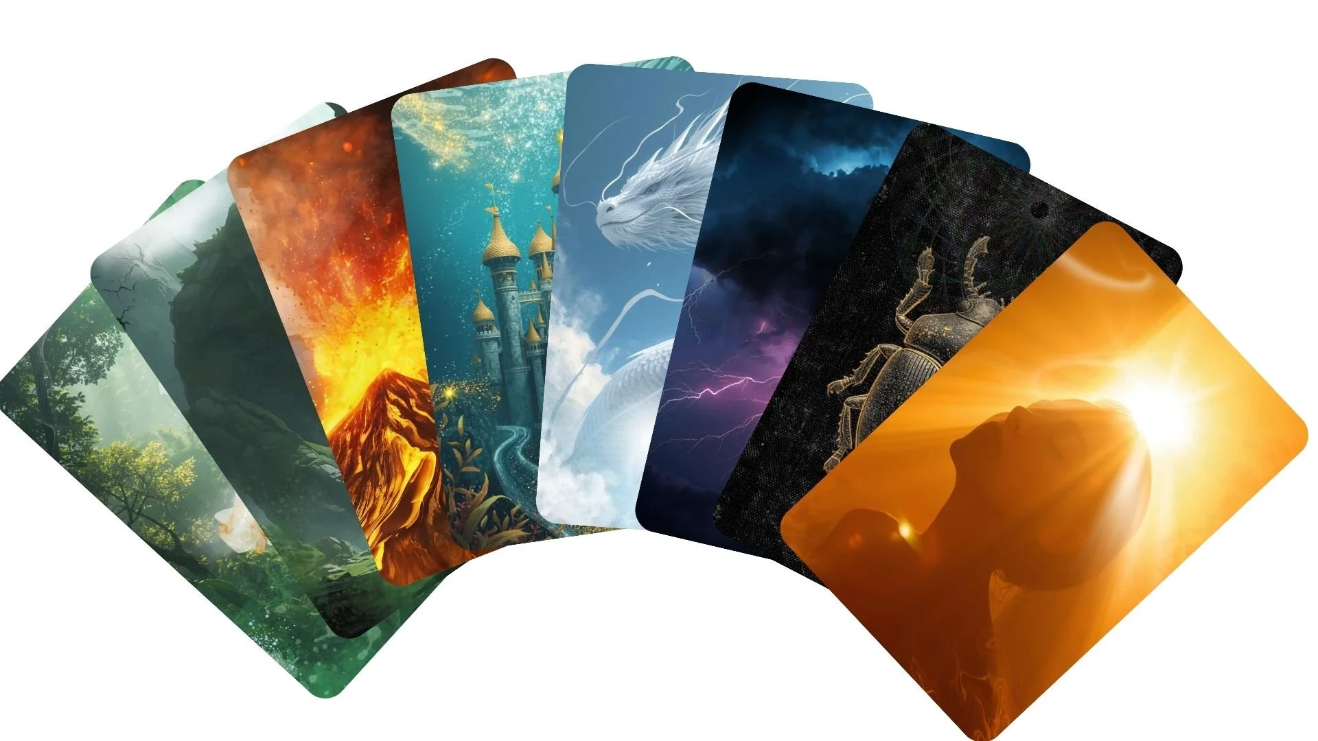 The card deck has 8 suits, for each Power of Creation a suit of 8 cards. Each card has a section in the guiding booklet with written text where you can read: